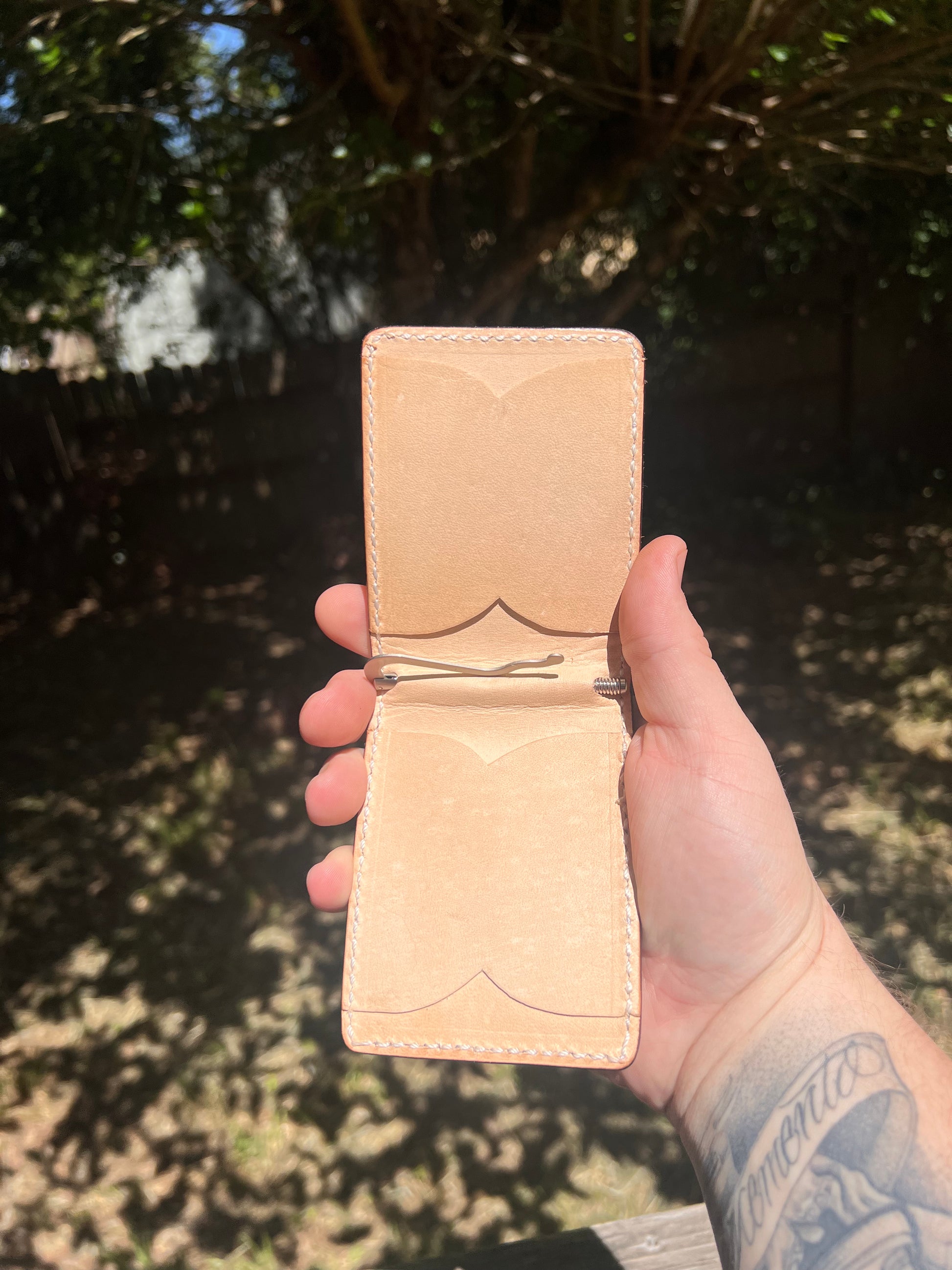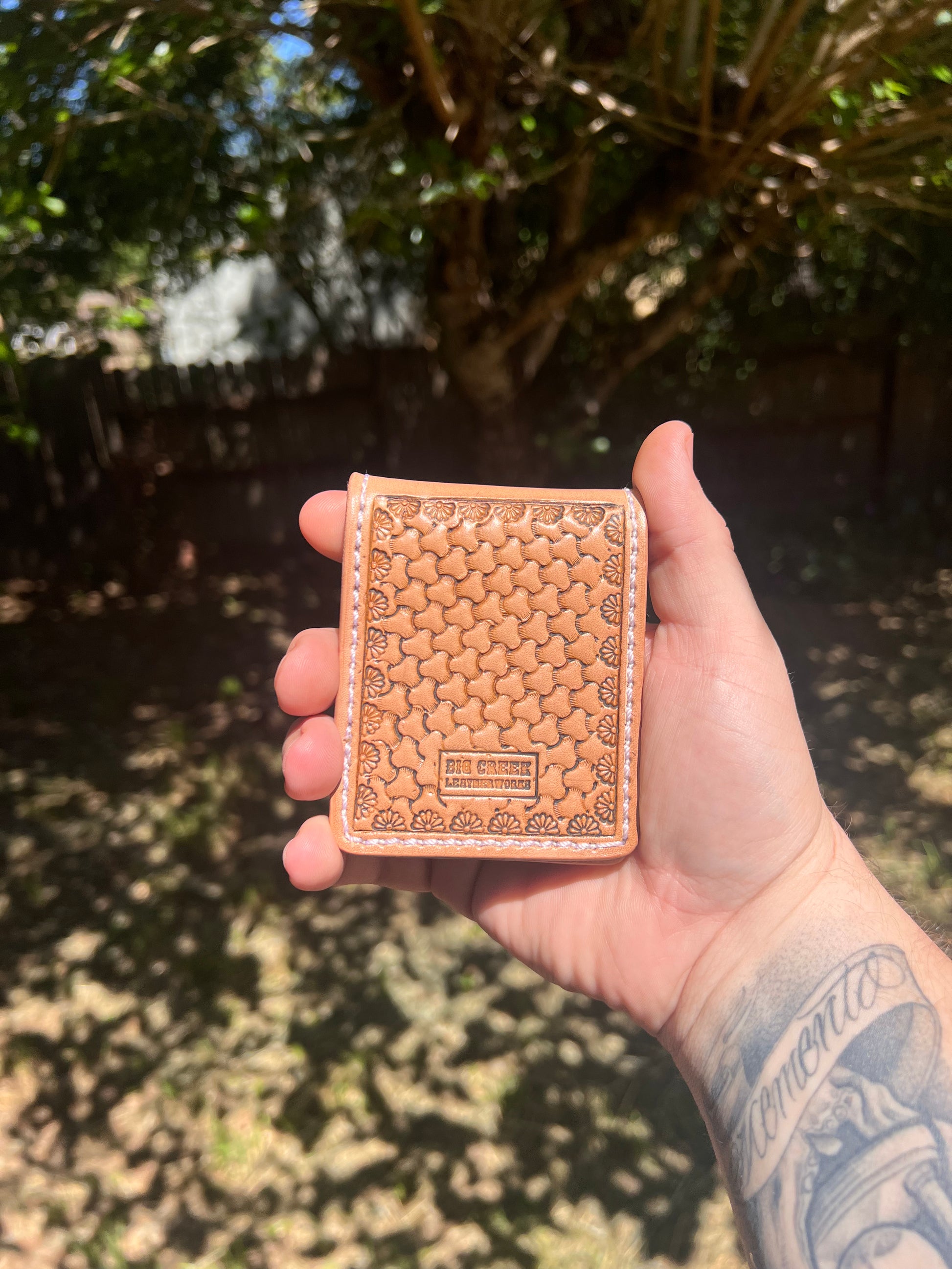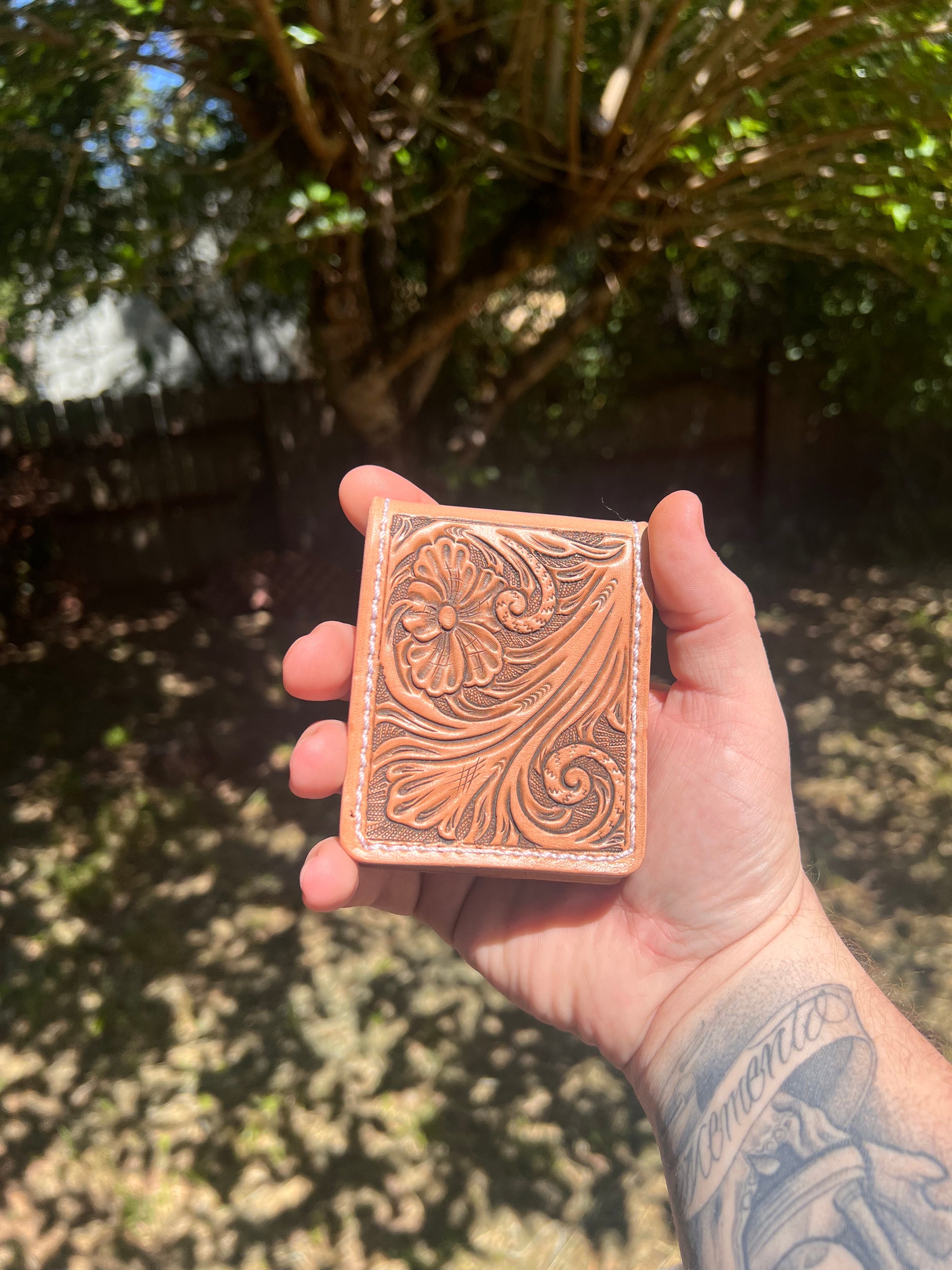 Tooled floral design featuring a spring-loaded money clip and card pockets on each side of the wallet. Each wallet is hand crafted from premium Hermann Oak leather and finished with the highest quality products to create a one-of-a-kind piece built to last.